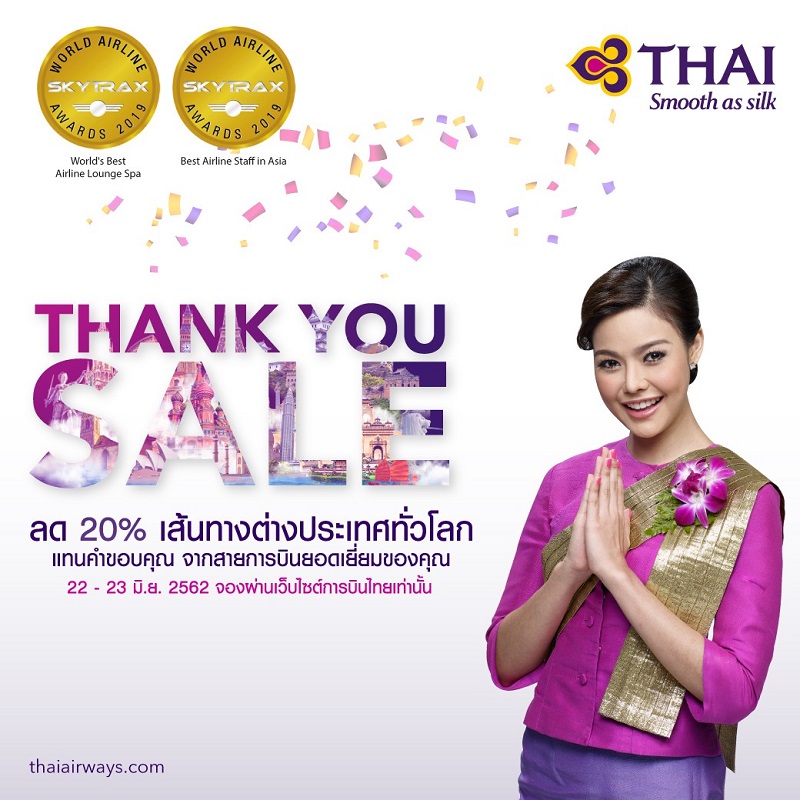 โอกาสนี้ การบินไทย ขอฉลองความสำเร็จ จัดโปรโมชั่น “Thank You Sale” แทนคำขอบคุณลูกค้าทุกท่าน มอบส่วนลดราคาบัตรโดยสารชั้นประหยัด 20% ทั้งหมด 66 จุดบินทั่วโลก โดยสามารถพบที่สุดแห่งความคุ้มค่านี้ ผ่าน เว็บไซต์ thaiairways.com เท่านั้น วันเสาร์ 22 มิ.ย. และวันอาทิตย์ 23 มิ.ย. 62 นี้ 2 วัน เท่านั้น สำหรับการออกเดินทางได้ตั้งแต่ 22 มิ.ย. – 20 ก.ค. 62 ติดตามข้อมูลเพิ่มเติมและจองได้ที่ http://bit.ly/2Kvyk5I