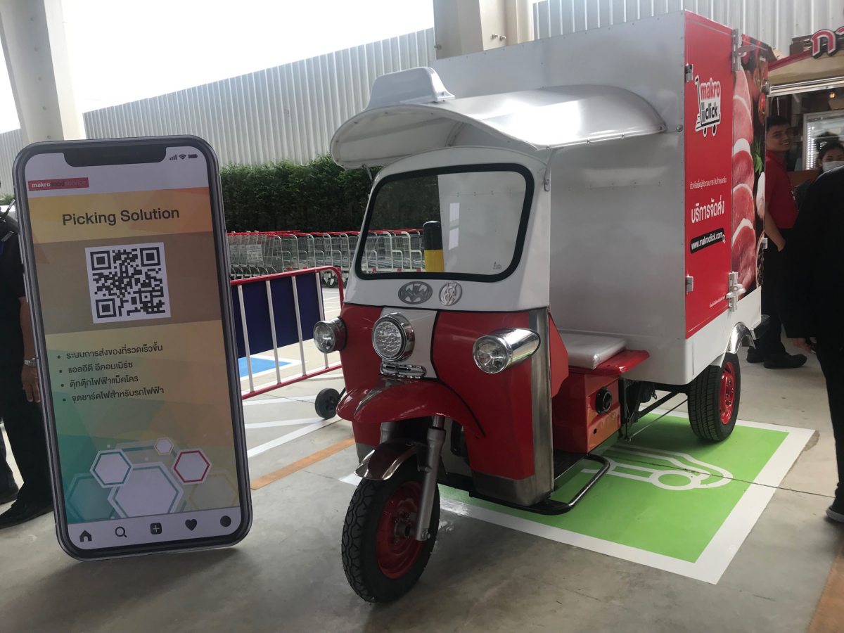 ตุ๊กตุ๊กไฟฟ้าแม็คโคร : ตุ๊กตุ๊กพลังงานไฟฟ้า ส่งเสริมการขนส่งแบบประหยัดพลังงาน พร้อมติดตั้งแผงโซลาร์เซลล์ ขนาดพอเหมาะ เพื่อนำพลังงานมาใช้ในห้องควบคุมอุณหภูมิ สำหรับใช้ในการจัดส่งสินค้าบริเวณใกล้เคียง ในรัศมี 5 กิโลเมตรโดยรอบ โดยจัดส่งได้ทั้งอาหารสด และสินค้าโกรเซอรี่ทั่วไป