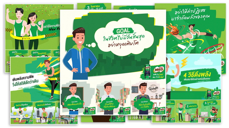 เสริมด้วย Facebook contents บนแฟนเพจ MILO Thailand ที่ช่วยปลุกพลังกลุ่มเป้าหมาย กระตุ้นให้ทำตามเป้าหมายที่มีให้สำเร็จ ด้วยเคล็ดลับช่วยพิชิตเป้าหมาย ทั้งในเรื่องของการกีฬา การเรียน การทำงาน และเมื่อเป้าหมายไหนสำเร็จแล้ว ก็อย่าเพิ่งหยุด เพราะชีวิตยังมีเป้าหมายใหม่ๆ อยู่เสมอ พร้อมข้อความปลุกใจที่ช่วยให้เขาไม่ย่อท้อต่ออุปสรรคที่ต้องเจอระหว่างทาง