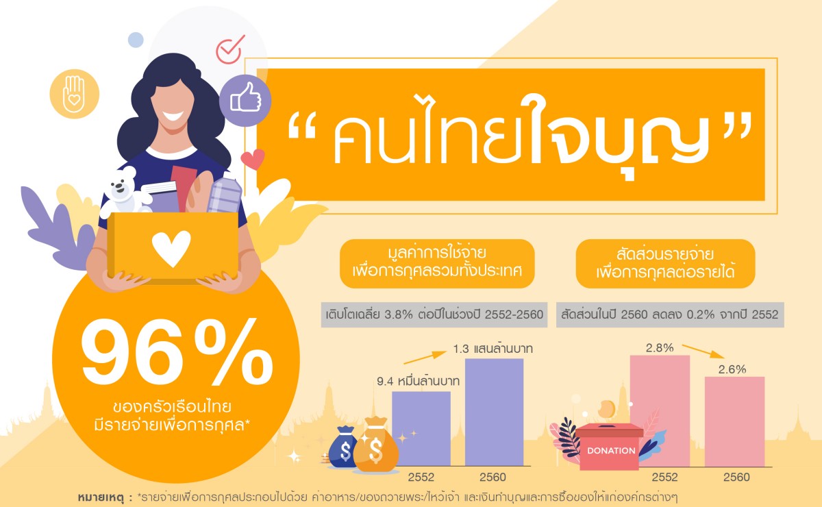 ศูนย์วิจัยเศรษฐกิจและธุรกิจ ธนาคารไทยพาณิชย์ หรืออีไอซี ทำการวิเคราะห์ข้อมูลการสำรวจภาวะเศรษฐกิจและสังคมครัวเรือนไทยในปี 2552-2560 ของสำนักงานสถิติแห่งชาติ พบว่า มีจำนวนครัวเรือนไทยเกือบทั้งหมด หรือมีถึง 96% ที่มีรายจ่ายสำหรับเพื่อการกุศล