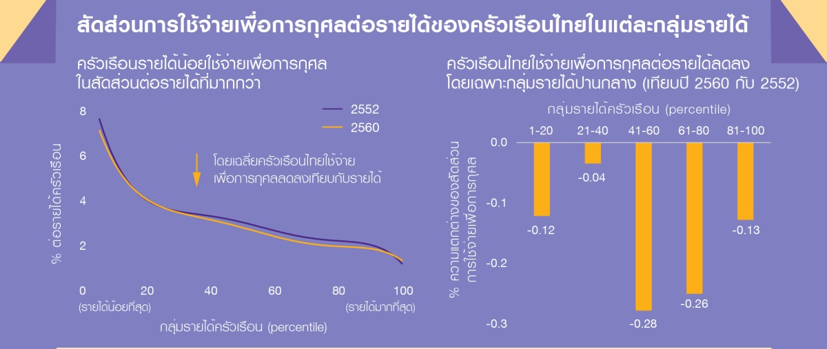ทั้งนี้ สัดส่วนของรายจ่ายเพื่อการการกุศลต่อรายได้ครัวเรือนโดยเฉลี่ยลดลง จาก 2.8% ต่อรายได้ครัวเรือน ในปี 2552 มาอยู่ที่ 2.6% ในปี 2560 โดยเป็นการลดการใช้จ่ายลงของครัวเรือนในทุกระดับชั้นรายได้