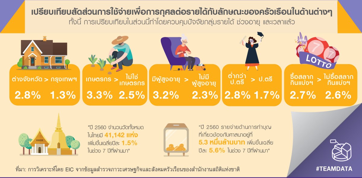 ขณะที่ครัวเรือนรายได้น้อย แต่มีสัดส่วนรายจ่ายเพื่อการกุศลต่อรายได้มากกว่า แม้ครัวเรือนไทยจะทำบุญตามกำลังทรัพย์ที่มี หรือส่วนใหญ่จะยึดแนวทางมีมากทำมาก มีน้อยทำน้อย แต่เมื่อเปรียบเทียบสัดส่วนของรายจ่ายเพื่อการทำบุญต่อรายได้ระหว่างครัวเรือนในระดับรายได้ต่าง ๆ แล้วจะพบว่า ครัวเรือนรายได้น้อยมีสัดส่วนรายจ่ายเพื่อการกุศลต่อรายได้สูงกว่า