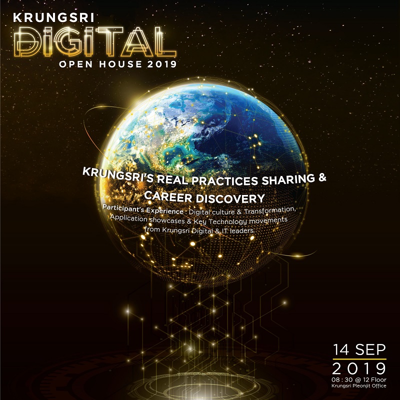 กรุงศรี เปิดบ้านต้อนรับผู้สนใจในการขับเคลื่อนธุรกิจบนวิสัยทัศน์และนวัตกรรมภายใต้แนวคิด “Think Digital First” ที่ส่งผลให้กรุงศรีเป็นหนึ่งในผู้นำด้านนวัตกรรมทางการเงินของไทยสำหรับชีวิตวันนี้ ในงาน KRUNGSRI DIGITAL OPEN HOUSE 2019 ในวันเสาร์ที่ 14 กันยายน 2562 เวลา 9.30 – 16.00 น. ณ อาคารกรุงศรี สำนักงานเพลินจิต บนสี่แยกถนนวิทยุ-เพลินจิต
