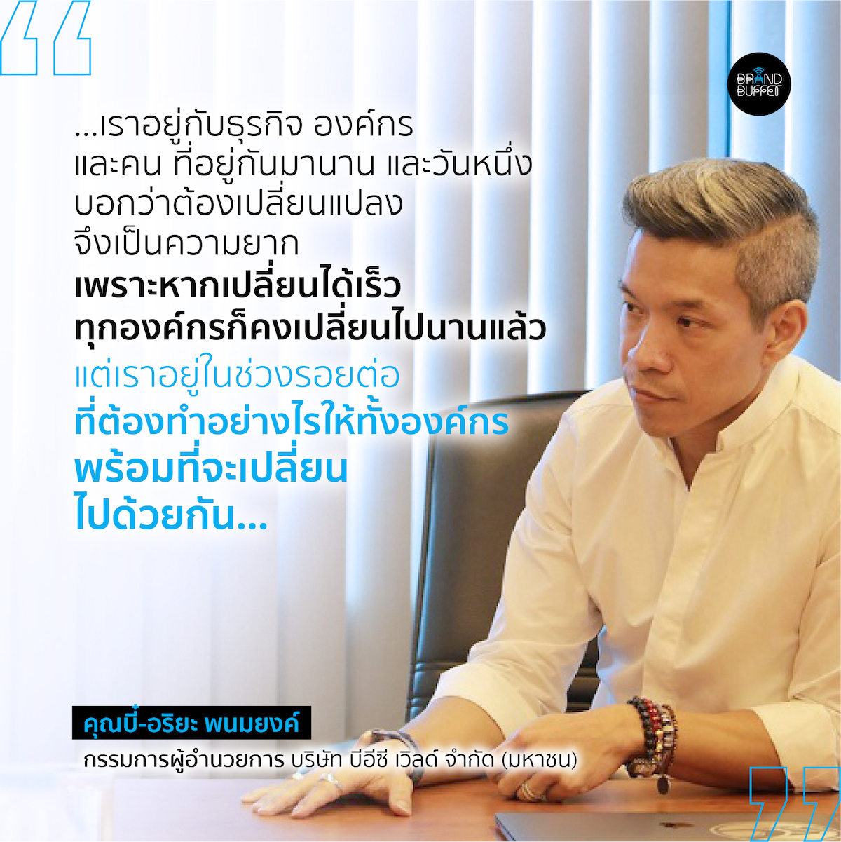 “ตอนตัดสินใจมารับตำแหน่ง President บีอีซี คิดไว้แล้วว่าไม่ง่าย การทำงานช่วง 5 เดือนที่ผ่านมา คอนเฟิร์มความคิดก่อนมาว่า ยากอย่างที่คิดไว้จริงๆ” คุณอริยะ พนมยงค์ กรรมการผู้อำนวยการ บริษัท บีอีซี เวิลด์ จำกัด (มหาชน) กล่าวเปิดใจหลังรับหน้าที่ President บีอีซี เวิลด์ เข้าสู่เดือนที่ 6