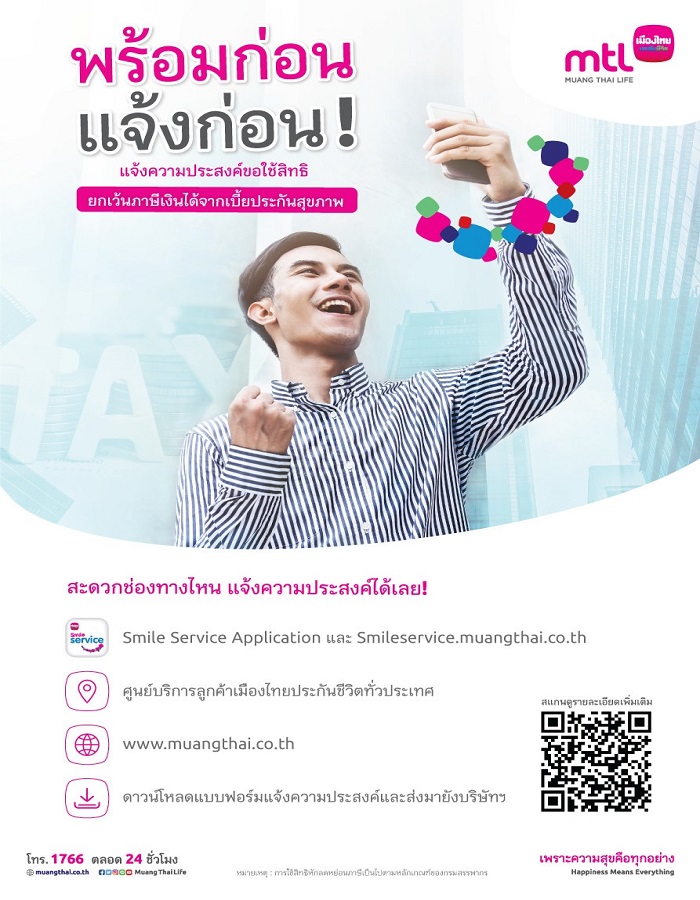 โดยผู้เอาประกันภัยของบริษัทฯ ที่มีสัญญาเพิ่มเติมการประกันสุขภาพ และต้องการใช้สิทธิลดหย่อนภาษีเงินได้บุคคลธรรมดา ผู้เอาประกันภัยต้องแจ้งความประสงค์มายังบริษัทฯ เพื่อให้บริษัทฯ นำส่งข้อมูลเบี้ยประกันสุขภาพไปยังกรมสรรพากร ซึ่งลูกค้าสามารถแจ้งความประสงค์ผ่านขั้นตอนที่ไม่ยุ่งยาก โดยแจ้งความประสงค์ผ่านช่องทาง Smile Service Application หรือ Smileservice.muangthai.co.th หรือที่ศูนย์บริการลูกค้าเมืองไทยประกันชีวิตทั่วประเทศ หรือ ทำรายการผ่านช่องทางเว็บไซต์ www.muangthai.co.th หรือ ดาวน์โหลดแบบฟอร์มแจ้งความประสงค์และส่งมายังบริษัทฯ ทั้งนี้สามารถสอบถามรายละเอียดเพิ่มเติมได้ที่ โทร. 1766 เมืองไทยประกันชีวิตทุกวัน ตลอด 24 ชั่วโมง