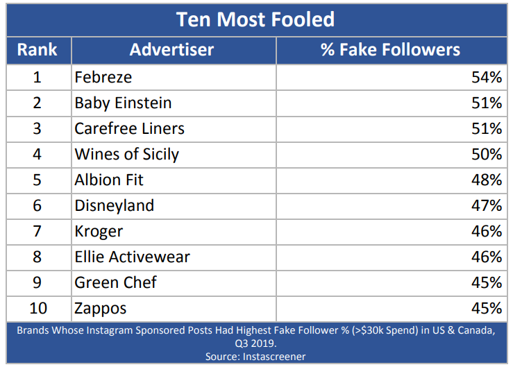ซึ่งจากการวิเคราะห์แล้วพบว่า Febreze บริษัทในเครือ P&G คือแบรนด์ที่ถูกหลอกให้จ่ายเงินเพื่อลงโฆษณาในลักษณะดังกล่าว “มากที่สุด” เนื่องจากเมื่อใช้ AI วิเคราะห์ดูแล้วพบว่า โพสต์ที่จ้าง Influencers บน Instagram นั้น เข้าถึงบ็อทมากกว่า 54%
