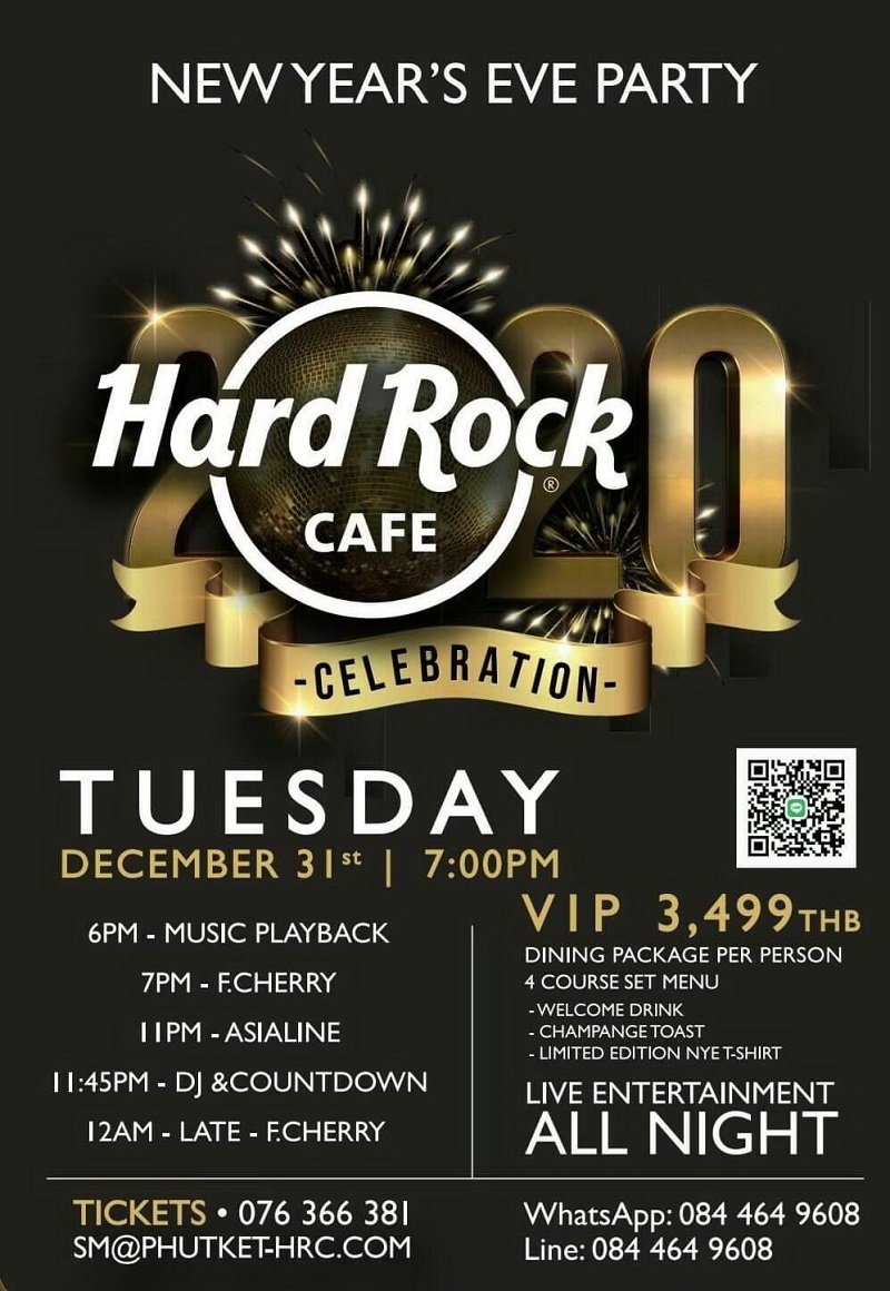 31 ธันวาคมนี้ ตั้งแต่ 1 ทุ่มเป็นต้นไป Hard Rock Cafe สาขาภูเก็ตจัดปาร์ตี้ข้ามปีรับศักราชใหม่ให้บรรดาขาร็อค ด้วยแพคเกจฉลองปีใหม่ ตั้งแต่เครื่องดื่มต้อนรับ จนถึงเมนูพิเศษ 4 รายการ ปิดท้ายด้วยเสื้อทีเชิร์ตฮาร์ดร็อคคาเฟ่สะท้อนแสงรุ่นลิมิเต็ดอิดิชั่น ก่อนร่วมกันนับถอยหลังเปิดแชมเปญฉลองค่ำคืนส่งท้ายปีเก่าและก้าวเข้าสู่ปีใหม่ 2020 ไปด้วยกัน