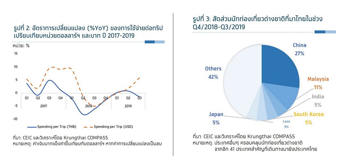 ดร.กิตติพงษ์ เรือนทิพย์ และ คุณจารุวรรณ เหล่าสัมฤทธิ์ นักวิจัยจาก Krungthai COMPASS วิเคราะห์ผ่านงานวิจัย “คนต่างชาติเที่ยวไทยเพิ่ม แต่ใช้จ่ายต่อทริปลดลง…หรือนักท่องเที่ยวไม่ค่อยใช้จ่ายในไทยแล้ว?” โดยระบุว่า ค่าใช้จ่ายต่อทริปของนักท่องเที่ยวต่างชาติที่ลดลง หากจะมองเป็นสัญญาณที่สะท้อนว่านักท่องเที่ยวต่างชาติใช้จ่ายในประเทศไทยลดน้อยลงก็อาจไม่ผิดนัก แต่หากจะฟันธงชัดเจนว่าเป็นสาเหตุหลักเลยก็คงจะไม่ถูกต้องทั้งหมดเช่นกัน เนื่องจากมีปัจจัยสำคัญเรื่องค่าเงินบาทที่แข็งค่าขึ้นเป็นอย่างมากในช่วง 2-3 ปีที่ผ่านมานี้