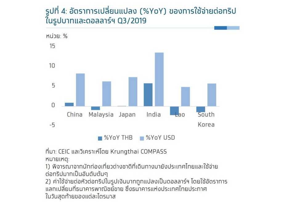 การเติบโตของธุรกิจท่องเที่ยวเป็นปัจจัยสำคัญในการพยุง GDP ประเทศไทยไตรมาสล่าสุดที่ผ่านมา โดยตัวเลขรายได้จากนักท่องเที่ยวต่างชาติเพิ่มขึ้น 5.8% ขณะที่ในแง่จำนวนเพิ่มขึ้น 7.2% แต่ภายใต้ตัวเลขที่เพิ่มขึ้น กลับพบว่าค่าใช้จ่ายต่อหัวต่อทริปในรูปเงินบาทของนักท่องเที่ยวต่างชาติกลับลดลง -1.3% เมื่อเทียบจากปีที่ผ่านมา สิ่งที่เกิดขึ้นนี้จะเป็นการสะท้อนว่า นักท่องเที่ยวต่างชาติไม่ค่อยใช้จ่ายในไทยแล้วหรือไม่