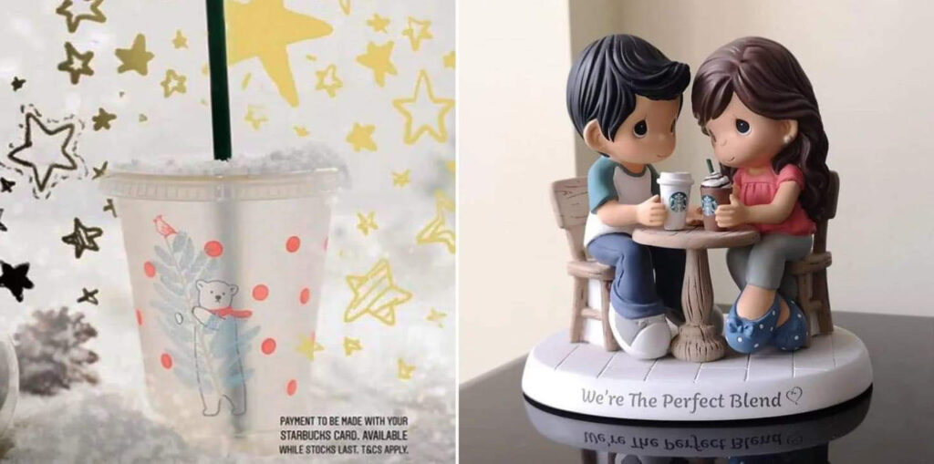และในปีนี้ “Starbucks” ยังได้ร่วมมือกับ “Precious Moments” สร้างสรรค์ของสะสมชิ้นใหม่ ซึ่งครั้งนี้มาในรูปแบบของ คู่รักสุดสวีทที่นั่งจับมือกันดื่มเครื่องดื่ม Starbucks พร้อมตัวฐานที่ระบุข้อความว่า “We’re The Perfect Blend” ที่จะวางจำหน่ายวันเดียวกันในราคา 139 เหรียญ