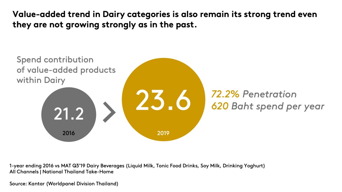 เครื่องดื่มที่มีคุณประโยชน์สูง หรือ Value Added Beverage ที่หลักๆ แล้วมักจะพบในกลุ่มสินค้าที่มีส่วนผสมของนม เป็นอีกหนึ่งกลุ่มสินค้าที่มีความสำคัญมากขึ้นในตลาด เรามักจะพบว่าช่วงหลังมานี้ นอกจากสินค้าเครื่องดื่มประเภทหวานน้อยหรือไม่หวานแล้ว ผู้ผลิตบางส่วนได้ให้ความสำคัญกับเครื่องดื่มที่มีการเน้นย้ำเรื่องของคุณประโยชน์มากขึ้น เพื่อตอบโจทย์กระแสรักสุขภาพ ซึ่งจะเห็นได้จากข้อมูลในตลาดว่า กลุ่มสินค้าหลักๆ อย่างกลุ่มสินค้าที่มีส่วนผสมของนมที่ปกติจะเน้นย้ำเรื่องคุณประโยชน์ ได้มีความสำคัญมากขึ้นในตลาดกว่าแต่ก่อนมาก ปัจจุบันกว่า 1 ใน 5 ของปริมาณเครื่องดื่มทั้งหมดที่ถูกซื้อ ได้มาจากสินค้าที่เน้นย้ำเรื่องนี้เป็นพิเศษ โดยที่สาเหตุมาจากการที่ในช่วงหลังมานี้ผู้บริโภคได้เข้ามาลองหรือทำการเพิ่มสินค้าประเภทนี้ลงไปในตะกร้าของตนกันมากขึ้น อีกทั้งยังมีผู้ซื้อบางส่วนที่ปกติซื้อสินค้าประเภทนี้อยู่แล้ว ได้ซื้อเพิ่มมากขึ้นอีกด้วย