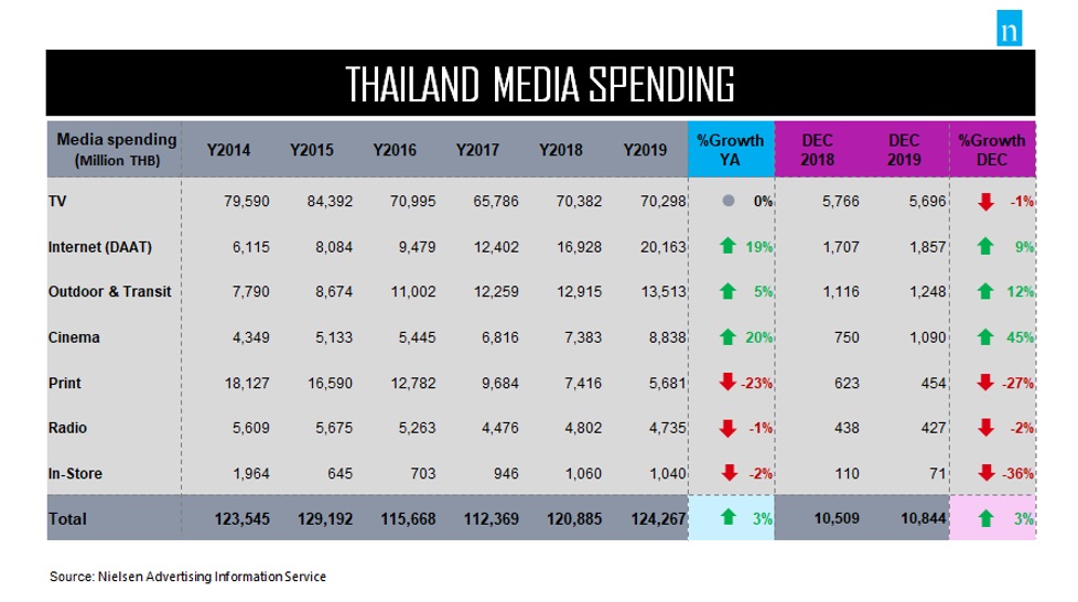 นีลเส็น ประเทศไทย รายงานมูลค่าเม็ดเงินโฆษณาปี 2019 เพิ่มขึ้น 3% เมื่อเทียบกับปี 2018 โดยมูลค่าอยู่ที่ 124,267 ล้านบาท สื่อทีวียังคงเป็นสื่อที่มีสัดส่วนของการใช้เม็ดเงินโฆษณาสูงสุดอยู่ที่ 57% “ดิจิทัล-สื่อนอกบ้าน” ครองตำแหน่งเติบโตสูง