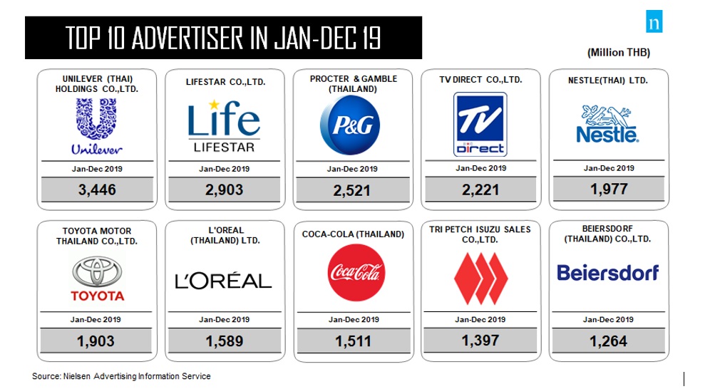 ท็อปเทน “บริษัท” ที่ใช้เม็ดเงินโฆษณาสูงสุดในปี 2019 ได้แก่ 1.ยูนิลีเวอร์ มูลค่า 3,446 ล้านบาท ลดลง 9% จากปี 2018 อันดับ 2. Life Star มูลค่า 2,903 ล้านบาท 3.พีแอนด์จี มูลค่า 2,521 ล้านบาท 4.ทีวีไดเร็ค มูลค่า 2,221 ล้านบาท 5.เนสท์เล่ มูลค่า 1,977 ล้านบาท 6.โตโยต้า มูลค่า 1,903 ล้านบาท 7.ลอรีอัล มูลค่า 1,589 ล้านบาท 8.โคคา-โคล่า มูลค่า 1,511 ล้านบาท 9.อีซูซุ มูลค่า 1,397 ล้านบาท และ 10. ไบเออร์สดอร์ฟ มูลค่า 1,264 ล้านบาท