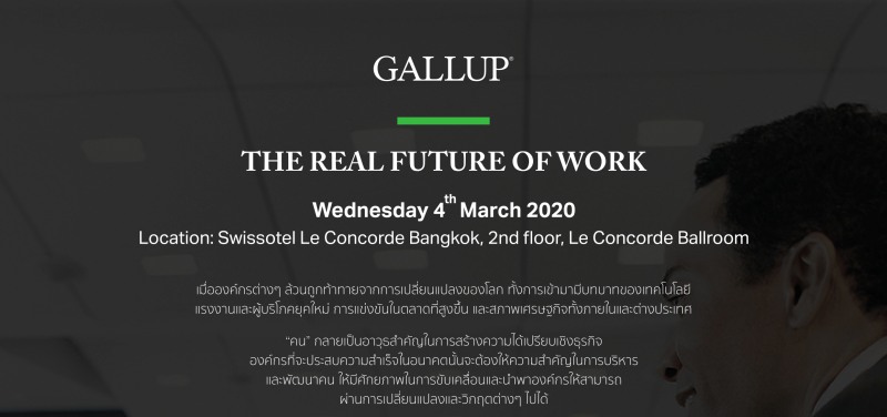 แกลลัพ ขอเชิญร่วมงาน “THE REAL FUTURE OF WORK 2020 – องค์กรยุคใหม่เปลี่ยนอย่างไรให้ปัง” โดยมีวัตถุประสงค์เพื่อเตรียมความพร้อมองค์กรและบุคลากรสำหรับ Disruptive World ในวันพุธที่ 4 มีนาคม 2563 เวลา 08.00-16.30 น. ณ โรงแรม Swissôtel Bangkok Ratchada ชั้น 2 ห้อง Le Concorde Ballroom พร้อมเปิดลงทะเบียนช่วง Early Bird ในราคาพิเศษ ตั้งแต่วันนี้ ถึง วันที่ 7 กุมภาพันธ์ 2563 ผู้ที่สนใจสามารถสอบถามข้อมูลเพิ่มเติมและสำรองที่นั่งได้ที่ คุณอาภัสรา โทร. 095-540-7555 หรืออีเมล aphatsara_khongthon@gallup.com