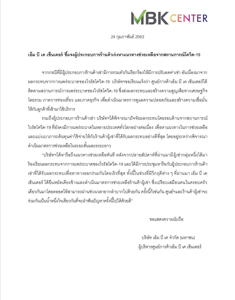 หลังจากกลุ่มร้านค้าเช่าในศูนย์การค้า MBK รวมตัวกันเดินขบวนในศูนย์การค้าเพื่อขอให้ MBK ลดค่าเช่าลง 50% หรือ ยกเลิกเก็บค่าเช่าในช่วงนี้ เนื่องจากได้รับผลกระทบอย่างหนักจากการแพร่ระบาดของไวรัสโควิด-19 (ไวรัสโคโรนา) ทำให้นักท่องเที่ยวต่างชาติ โดยเฉพาะชาวจีนลดลงอย่างมาก รวมทั้งคนไทยเองก็จับจ่ายลดลงในช่วงนี้