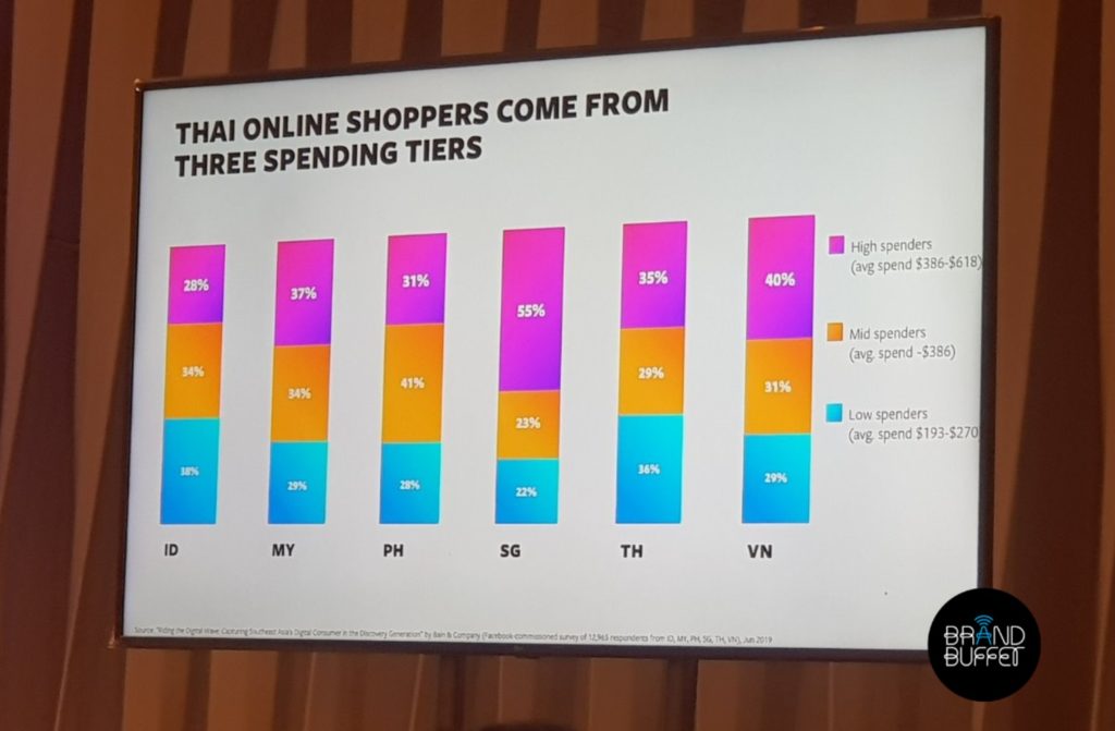 ข้อสอง ประเทศไทยมีนักช้อปกลุ่มที่เป็น High Spender 35% (ยอดใช้จ่าย 386 – 618 เหรียญสหรัฐต่อปี), Mid Spenders 29% (ยอดใช้่จ่าย 270 – 386 เหรียญสหรัฐต่อปี) และ Low Spenders 36% (ยอดใช้จ่าย 193 – 270 เหรียญสหรัฐต่อปี) ดังภาพ