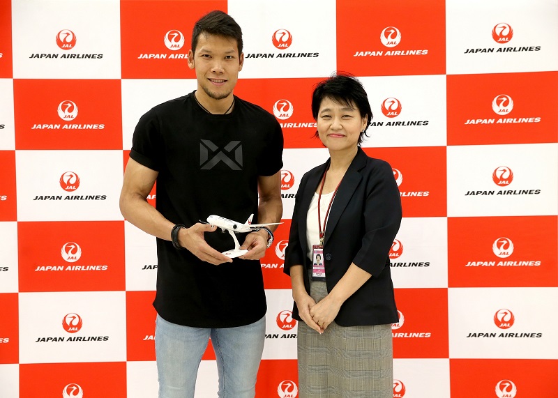 สายการบินเจแปน แอร์ไลน์ นำโดย คุณ ชิอากิ ภูประพันธ์ รองผู้จัดการภาค แผนกขาย และการตลาด (ขวา) มอบของที่ระลึกเป็นแบบจำลองเครื่องบินของสายการบินเจแปน แอร์ไลน์และร่วมแสดงความยินดีกับ คุณกวินทร์ ธรรมสัจจานันท์ ผู้รักษาประตูทีมชาติไทย (ซ้าย) ในโอกาสที่เดินทางไปเก็บตัวและร่วมซ้อมกับทีมคอนซาโดเล่ซัปโปโร เพื่อลงแข่งขันในศึกฟุตบอลเจลีก ฤดูกาล 2020 ณ ประเทศญี่ปุ่น ซึ่งได้เดินทางไปประเทศญี่ปุ่นโดยใช้บริการของสายการบินเจแปน แอร์ไลน์ เที่ยวบินที่ เจแอล 034 เส้นทาง กรุงเทพฯ – โตเกียว ณ ท่าอากาศยานนานาชาติสุวรรณภูมิ เมื่อวันก่อน