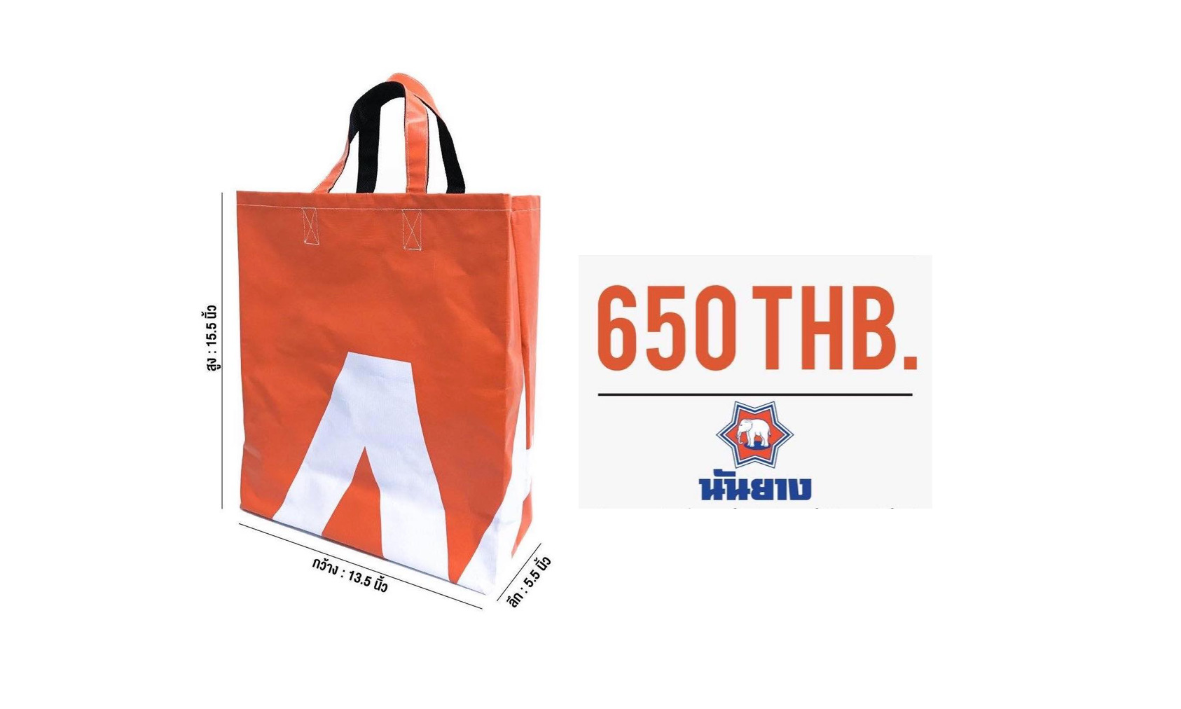 กระเป๋า NANYANG BAG ด้านนอกทำมาจากป้ายไวนิลโฆษณารองเท้านันยาง ด้านใน เป็นผ้าที่เหลือจากกระบวนการผลิตรองเท้านันยาง ขนาดกว้าง 13.5 นิ้ว สูง 15.5 นิ้ว และ ลึก 5.5 นิ้ว