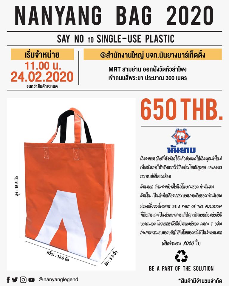 NANYANG BAG เป็นส่วนหนึ่งของโครงการ “Be a part of solution” เพื่อให้ธุรกิจมีส่วนร่วมในการเข้าไปแก้ปัญหาต่างๆ ในสังคม รวมทั้งเรื่องของสิ่งแวดล้อม โปรเจ็กต์ก่อนหน้านี้ที่ออกมาคือ รองเท้าแตะ KHYA (ขยะ) นั่นเอง