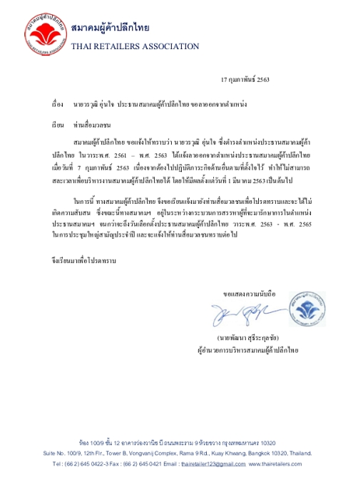 เรื่อง นายวรวุฒิ อุ่นใจ ประธานสมาคมผู้ค้าปลีกไทย ขอลาออกจากตําแหน่ง
