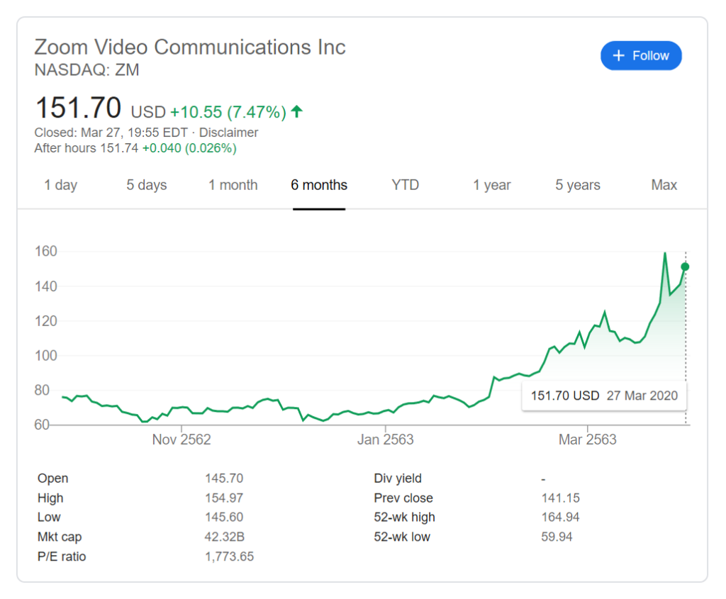 โดยสิ่งที่นักวิเคราะห์มองว่าสมเหตุสมผลที่หุ้นของ Zoom จะเติบโต มาจากการแพร่ระบาดของ Covid-19 ทำให้ภาคธุรกิจ โรงเรียน และหน่วยงานต่าง ๆ ประกาศให้ทุกคนปรับตัวสู่การ Work From Home ส่งผลให้มีความต้องการแอปพลิเคชันด้าน VDO Conferencing เพิ่มสูง จึงมีการคาดการณ์กันว่าผลประกอบการของ Zoom ในปีนี้ก็น่าจะกำไรต่อเนื่องจากปีที่แล้วด้วย สอดคล้องกับผลวิจัยของบริษัท Transparency Market Research ที่คาดการณ์ว่าธุรกิจ VDO Conferencing จะมีการเติบโตปีละ 8.4% ในช่วงปี 2020 – 2027 เลยทีเดียว