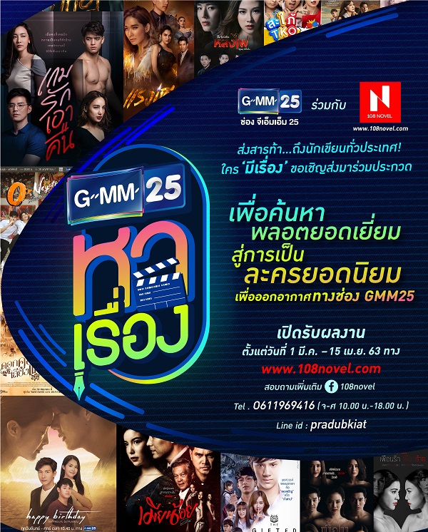 “ช่อง GMM25” ดิจิทัลทีวีของทุกคน ที่มีละครสนุกให้ดูมากที่สุด ด้วยเรตติ้งและกระแสตอบรับที่ดีอย่างต่อเนื่อง ร่วมมือกับเว็บไซด์นวนิยายออนไลน์ “www.108novel.com” ผุดโครงการ “GMM25 หาเรื่อง” เพื่อค้นหาสุดยอดพลอตและนิยาย สู่การเป็นละครยอดนิยม เพื่อออกอากาศทางช่อง GMM25 โดยเชิญชวนนักเขียนทั่วประเทศที่พร้อมมีเรื่องส่งผลงานเข้าประกวดได้แล้วตั้งแต่วันที่ 1 มีนาคม – 15 เมษายน 2563