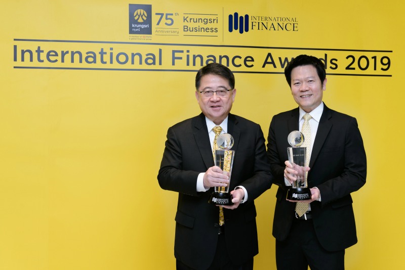 นายพรสนอง ตู้จินดา (ซ้าย) ประธานกลุ่มธุรกิจลูกค้าธุรกิจ และ นายสยาม ประสิทธิศิริกุล (ขวา) ประธานคณะเจ้าหน้าที่ด้านลูกค้าธุรกิจ SME ธนาคารกรุงศรีอยุธยา จำกัด (มหาชน) รับรางวัล Best Corporate Bank – Thailand 2019 และ Best SME Bank – Thailand 2019 จากงาน International Finance Awards 2019
