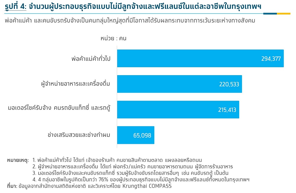 ขณะที่ ผู้ประกอบธุรกิจแบบไม่มีลูกจ้าง และฟรีแลนซ์ คือกลุ่มที่ใหญ่ที่สุดที่มีโอกาสได้รับผลกระทบ โดยคนกลุ่มนี้มีจำนวนกว่า 1 ล้านคน โดยส่วนใหญ่ ประมาณ 76% ทำอาชีพขายสินค้า ขายอาหาร ขับรถแท็กซี่ มอเตอร์ไซค์รับจ้าง ตลอดจนประกอบอาชีพช่างทำผม ช่างเสริมสวย (รูปที่ 4)