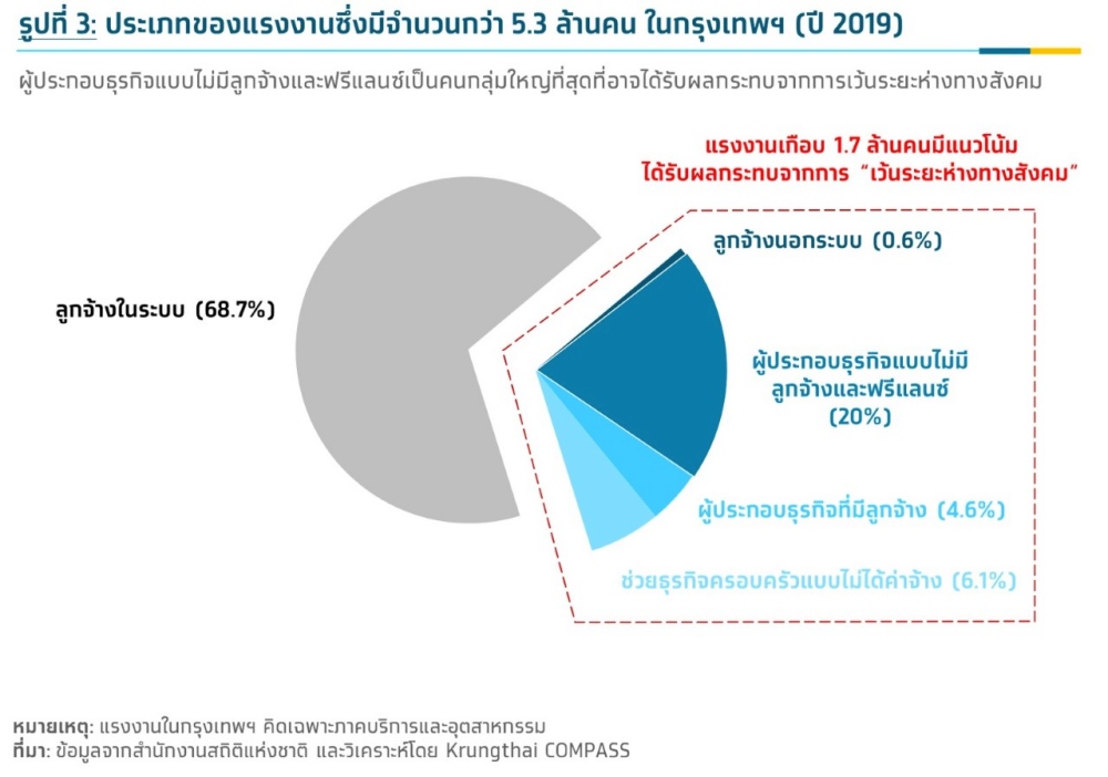 Krungthai COMPASS คาดว่า กลุ่มคนทำงานเกือบ 1.7 ล้านคน ที่มีโอกาสได้รับผลกระทบจากการเว้นระยะห่างทางสังคม ไม่ว่าจะเป็นกลุ่มลูกจ้างนอกระบบกว่า 3.2 หมื่นคน ซึ่งมักไม่มีการทำสัญญาจ้างที่แน่ชัด และเสี่ยงต่อการถูกพักงานแบบไม่ได้ค่าจ้างในช่วงนี้ ยกตัวอย่างเช่น กรรมกรก่อสร้าง พนักงานเสิร์ฟ คนโบกรถ สาวเชียร์เบียร์ เป็นต้น นอกจากกลุ่มแรงงานนอกระบบแล้ว ยังมีคนกลุ่มใหญ่ที่จะได้รับผลกระทบ คือ ผู้ประกอบธุรกิจแบบไม่มีลูกจ้างและฟรีแลนซ์ ผู้ประกอบธุรกิจที่มีลูกจ้าง และผู้ช่วยธุรกิจครอบครัวแบบไม่ได้ค่าจ้าง ซึ่งมีจำนวนสูงถึง 1.6 ล้านคน คิดเป็น 30.7% ของคนทำงานทั้งหมดในกรุงเทพฯ (รูปที่ 3)