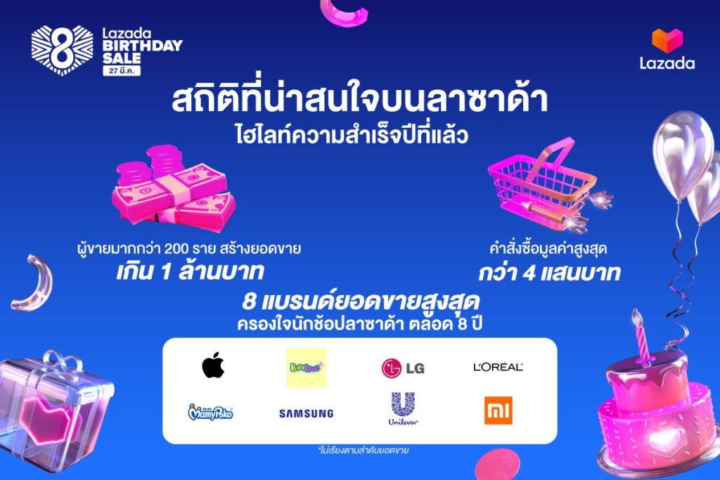 นอกจากนี้ คุณภารดียังได้กล่าวถึงสถิติที่น่าสนใจของแคมเปญ Lazada 7th Birthday เมื่อปีที่ผ่านมาว่า สามารถช่วยสร้างยอดขายให้กับผู้ประกอบการได้อย่างสูง โดยมีผู้ขายมากกว่า 200 รายที่มียอดขายบนแพลตฟอร์มสูงกว่า 1 ล้านบาท ขณะที่คำสั่งซื้อที่มีมูลค่าสูงสุดต่อการสั่งซื้อ 1 ครั้ง มีตัวเลขสูงกว่า 4 แสนบาท