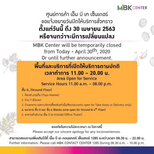 จากที่มีประกาศกรุงเทพมหานคร เรื่องปิดสถานที่เป็นการชั่วคราวเพิ่มเติม ฉบับที่ 4 ศูนย์การค้าในเครือเอ็ม บี เค ประกอบด้วย เอ็ม บี เค เซ็นเตอร์ พาราไดซ์ พาร์ค พาราไดซ์ เพลส และ เดอะไนน์ เซ็นเตอร์ พระราม 9 จึงขยายระยะเวลาปิดให้บริการชั่วคราวจนถึงวันที่ 30 เมษายน 2563 เพื่อร่วมเป็นส่วนหนึ่งในการลดการแพร่ระบาดของไวรัสโควิด-19 จึงขออภัยลูกค้าในความไม่สะดวกมา ณ โอกาสนี้ อย่างไรก็ตามในส่วนของร้านค้าที่ได้รับการยกเว้นตามประกาศจะยังคงเปิดให้บริการตามปกติ ไม่ว่าจะเป็นซูเปอร์มาร์เก็ต ร้านขายยา ร้านอาหาร เพื่ออำนวยความสะดวกแก่ประชาชนในการเข้าถึงสินค้าที่จำเป็นในชีวิตประจำวัน ได้แก่