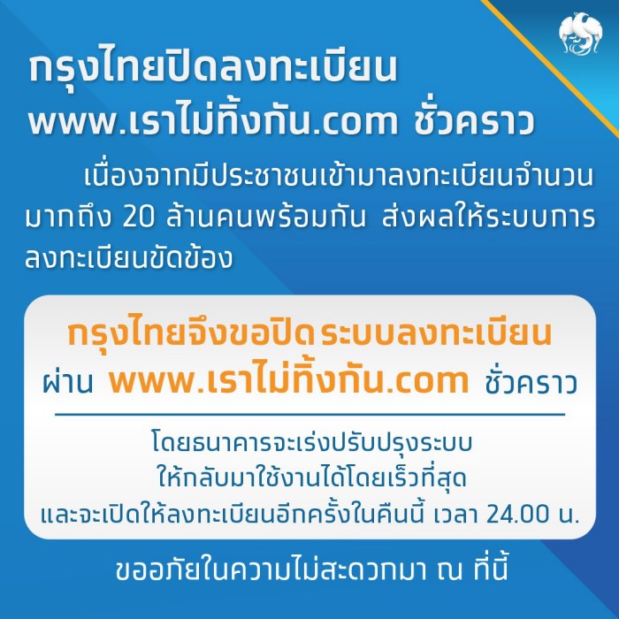นายผยง ศรีวณิช กรรมการผู้จัดการใหญ่ ธนาคารกรุงไทย เปิดเผยว่า ก่อนเปิดระบบมีประชาชนรอลงทะเบียนกว่า 2 ล้านคน หลังจากเปิดระบบใน 2 นาทีแรกมีประชาชนเข้ามาลงทะเบียนจำนวนมากถึง 20 ล้านคน ส่งผลให้ระบบการลงทะเบียนขัดข้องไม่สามารถใช้งานได้ ดังนั้นธนาคารกรุงไทยจึงขอปิดระบบลงทะเบียน ผ่านเว็บไซต์ www.เราไม่ทิ้งกัน.com เป็นการชั่วคราว โดยธนาคารจะเร่งปรับปรุงระบบและจะเปิดให้ลงทะเบียนในคืนนี้ ตั้งแต่เวลา 24.00 น. เป็นต้นไป