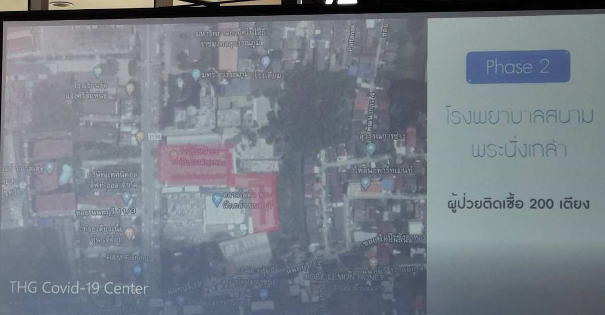 เฟสที่ 2 ก่อสร้าง โรงพยาบาลสนาม กรณีที่มีการแพร่ระบาดเข้าสู่เฟส 3 โดยจัดพื้นที่สำหรับผู้ป่วยติดเชื้อแต่ไม่วิกฤติจำนวน 200 เตียง และห้องผู้ป่วยวิกฤติ (ICU) อีก 50 เตียง โดยโรงพยาบาลสนามแห่งนี้จะตั้งอยู่บริเวณหน้าโรงพยาบาลพระนั่งเกล้า บนพื้นที่ 4 ไร่ โดยใช้ระยะเวลาก่อสร้าง 3 เดือน ในพื้นที่ดังกล่าวยังสามารถขยายเพิ่มได้อีก 300 เตียง กรณีที่มีผู้ป่วยจำนวนมากต่อวัน หรือรวม 500 เตียง หาก่อสร้างโรงพยาบาลสนามขนาด 500 เตียง จะใช้งบประมาณราว 1,500 ล้านบาท รวมเครื่องมือ เนื่องจากห้องผู้ป่วยไอซียู สำหรับดูแลผู้ป่วยหนักเฉลี่ยห้องละ 20 ล้านบาท ต้องติดตั้งเครื่องช่วยหายใจ ซึ่งสั่งมาจากสหรัฐแล้ว 20 เครื่อง