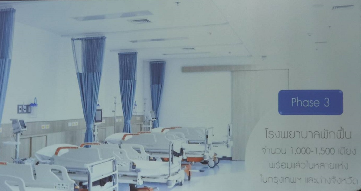 เฟสที่ 3 โรงพยาบาลพักฟื้น สำหรับรองรับผู้ป่วยจำนวนมาก ที่จำเป็นต้องรักษาตัวและฟื้นฟูร่างกายในโรงพยาบาลระยะเวลานาน ๆ เฟสนี้หากมีผู้ป่วยจำนวนมาก กลุ่มธนบุรีที่มีโรงพยาบาลในเครือกว่า 20 แห่ง จะปรับโรงพยาบาลบางแห่ง มาดูแลผู้ป่วยโควิด ระยะพักฟื้น โดยเฉพาะ และย้ายผู้ป่วยทั้งหมดไปโรงพยาบาลในเครือแทน กลุ่มที่จะมาฟักฟื้นคือผู้ป่วยที่ออกจากโรงพยาบาลสนามและต้องใช้เวลาดูแลต่อ สามารถรองรับผู้ป่วยได้จำนวน 1,000-1,500 เตียง