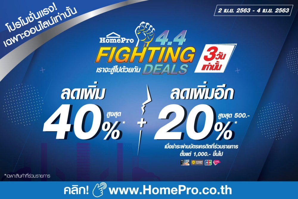 ห้ามพลาด!! 2-4 เมษายน 63 นี้เท่านั้น กับ แคมเปญ 4.4 HomePro Fighting Deals ช้อปออนไลน์ที่ www.homepro.co.th สอบถามรายละเอียดเพิ่มเติม Call Center 1284