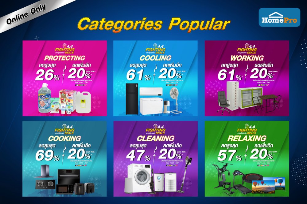Categories Highlight สินค้าขายดี 8 กลุ่มสินค้า ลดสูงสุด 60%อาทิ แอร์ผนัง, เครื่องฟอกอากาศ, น้ำยาทำความสะอาด, พัดลม, เฟอร์นิเจอร์สำนักงาน, ตู้เย็น, เครื่องใช้ไฟฟ้าขนาดเล็ก และ ทีวี