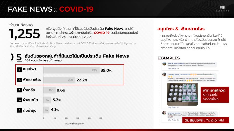 ในส่วนของ Fake News ประเด็นข่าวปลอมภายใต้สถานการณ์ COVID-19 พบว่าภายใน 1 สัปดาห์ (24 – 31 มีนาคม 2563) มีการพูดถึงกลุ่มคำที่มีแนวโน้มเป็นประเด็น Fake News กว่า 1,255 ครั้ง ซึ่งได้แก่ สมุนไพร ฟ้าทะลายโจร น้ำเกลือ ผ้าอนามัย และดื่มน้ำอุ่น