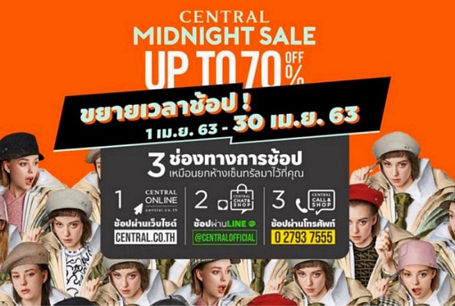 ห้างเซ็นทรัล ขยายเวลาจัดรายการ “CENTRAL MIDNIGHT SALE” (เซ็นทรัล มิดไนท์ เซล) งานเซลที่ทุกคนรอคอย ระหว่าง 1-30 เม.ย. 63 เดินหน้ารุกออนไลน์เต็มรูปแบบ พร้อมจัดทีมคอยอำนวยความสะดวกให้ลูกค้าช้อปสบายเสมือนยกห้างมาไว้ที่คุณ