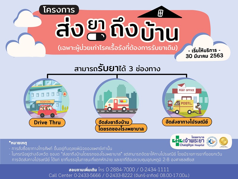 โรงพยาบาลเจ้าพระยา ตระหนักถึงความสำคัญของมาตรการป้องกันโรคติดเชื้อไวรัสโคโรนา 2019 (COVID-19) จึงได้จัดทำโครงการ “บริการส่งยาถึงบ้าน” เพื่ออำนวยความสะดวกให้แก่ผู้ป่วยเก่าโรคเรื้อรังของโรงพยาบาลฯ ที่ต้องการรับยาเดิมโดยไม่ต้องเดินทางมารับยาด้วยตนเอง และลดความแออัดของจำนวนผู้ป่วยในโรงพยาบาลท่ามกลางสถานการณ์การระบาดของโรคติดเชื้อไวรัสโคโรนา 2019 (COVID-19) สามารถสอบถามข้อมูลเพิ่มเติมได้ที่ Call Center 02-433-5666, 02-433-8222 หรือทาง Line ID: @chaophya