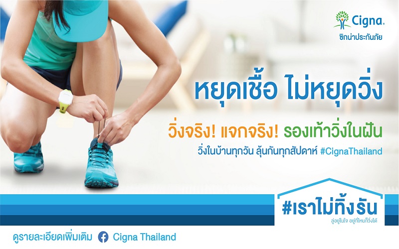 บริษัท ซิกน่า ประกันภัย จำกัด (มหาชน) ผู้นำด้านประกันสุขภาพระดับโลก ชวนผู้ที่รักสุขภาพร่วมสนุกกับออนไลน์แคมเปญใหม่ ‘#เราไม่ทิ้งรัน – Cigna Run At Home’ เชิญชวนให้คนไทยไม่หยุดที่จะดูแลสุขภาพตัวเองแม้ขณะอยู่บ้านเพื่อร่วมส่งเสริมมาตรการของภาครัฐในการทำ Social Distancing โดยกิจกรรมดังกล่าวสามารถเข้าร่วมสนุกได้ง่ายๆจากที่บ้าน พร้อมลุ้นเป็นผู้โชคดี รับฟรีรองเท้าวิ่งในฝัน แจกจริงทุกสัปดาห์ ตั้งแต่วันที่ 17 เมษายน จนถึงวันที่ 15 พฤษภาคม 2563 เท่านั้น