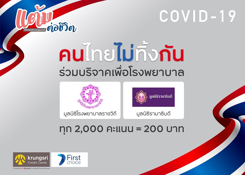 ผู้นำในธุรกิจบัตรเครดิตและสินเชื่อส่วนบุคคล สานต่อโครงการแต้มต่อชีวิตชวนสมาชิกบัตรเครดิตกรุงศรี และบัตรเครดิตกรุงศรีเฟิร์สช้อยส์บริจาคแต้มสะสมบัตรเครดิต ฯ เพื่อร่วมสมทบทุนสนับสนุนการรักษาผู้ป่วยติดเชื้อไวรัสโคโรนา (Covid-19) ตลอดจนการซื้ออุปกรณ์ทางการแพทย์ โดยจะมอบเงินบริจาคผ่านทางมูลนิธิโรงพยาบาลราชวิถี และมูลนิธิรามาธิบดี ทั้งนี้ สมาชิกบัตรฯ สามารถทำรายการบริจาคแต้มบัตรเครดิตได้ด้วยตนเองผ่านแอปพลิเคชัน UCHOOSE ทุก 2,000 คะแนนเท่ากับบริจาค 200 บาท ตั้งแต่ 1 เมษายน – 30 เมษายน 2563