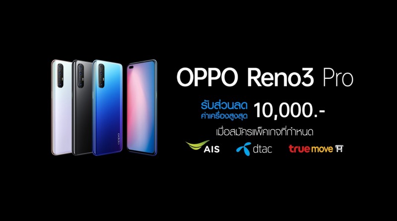 โดย OPPO Reno3 Pro พร้อมให้พรีออเดอร์ตั้งแต่ วันที่ 1 พฤษภาคม – 7 พฤษภาคม 2563 ในราคา 18,990 บาท และเมื่อจองกับ OPPO Brand Shop และตัวแทนจำหน่ายทั่วประเทศ รับไปเลยโปรโมชั่น 3 ต่อ! รวมมูลค่าทั้งหมด 7,990 บาท ดังนี้