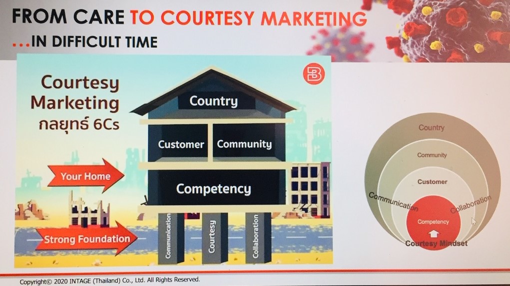 ขณะเดียวกัน แบรนด์ยังต้องมี ความเห็นอกเห็นใจ (COURTESY) อยากช่วยเหลือสังคมอย่างแท้จริง แต่การจะไปถึงจุดนั้นได้ ดร.ดั่งใจถวิล บอกว่า ต้องเริ่มจากการมี Courtesy Mindset ที่อยากช่วยเหลือสังคมจริงๆ ไม่ใช่มีเป้าหมายเพื่อทำ CSR โดยแบรนด์ที่มี Courtesy Mindset จะเข้าใจและรู้ว่าสามารถนำจุดแข็งที่มีไปช่วยสังคมได้อย่างไร เช่น บริษัทรถยนต์ตอนนี้ลูกค้าเข้ามาซื้อรถน้อยลงเพราะลดการเดินทางออกจากบ้าน ก็เปลี่ยนโรงงานรถยนต์นำวัตถุดิบมาทำเป็นเตียงคนไข้หรืออุปกรณ์ต่างๆ สำหรับแพทย์และพยาบาล เป็นต้น