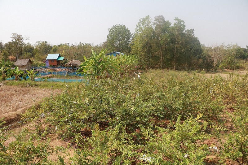 นอกจากมีน้ำใช้เพียงพอสำหรับทำเกษตรแล้ว พื้นที่เพาะปลูกของลุงคำมียังช่วยสร้างรายได้เพิ่มได้ตลอดทั้งปี ด้วยการทำ ‘เกษตรผสมผสาน ตามแนวทฤษฎีใหม่’ โดยเริ่มต้นจากจัดสรรแปลงที่ดินในพื้นที่กว่า 21 ไร่ เปลี่ยนจากเดิมที่ทำนา 12 ไร่ ก็ค่อย ๆ ลดพื้นที่ทำนาให้เหลือ 4-5 ไร่ พร้อมขุดสระน้ำ 2 สระ เพื่อให้มีน้ำไว้ใช้ทำเกษตรและเลี้ยงปลา และใช้พื้นที่ที่เหลือปลูกไม้ยืนต้น ไม้สวน รวมถึงพืชสมุนไพร โดยไม่ใช้สารเคมีกำจัดศัตรูพืช ทำให้ผลลัพธ์ที่ได้คือที่ดินกว่า 21 ไร่ของลุงคำมีเป็นแหล่งรายได้หมุนเวียน มีผลผลิตที่เก็บเกี่ยวได้ทั้งรายวัน รายเดือน และรายปี
