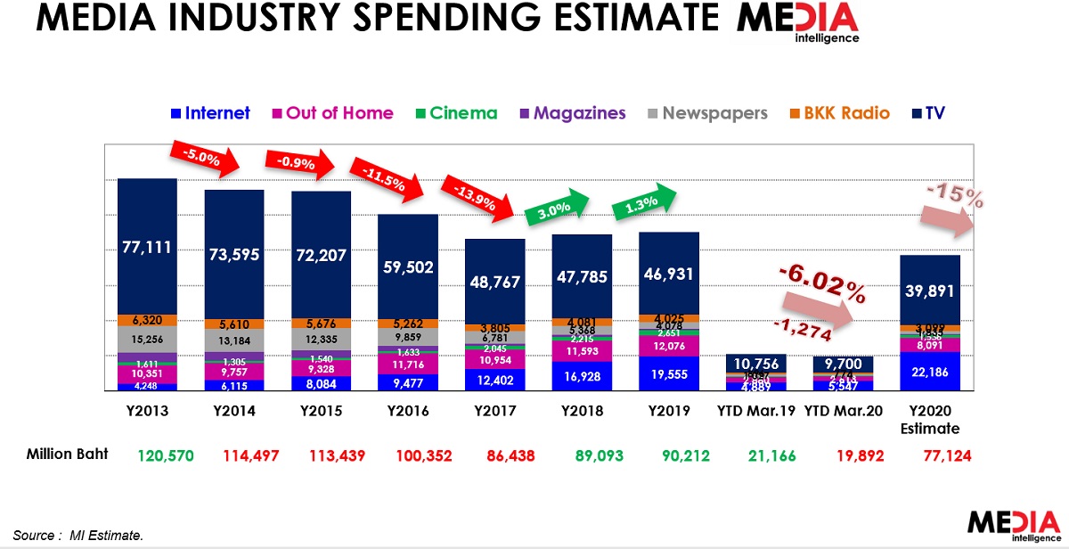แม้เริ่มมีสัญญาณผ่อนปรนมาตรการจากภาครัฐ ให้ธุรกิจที่มีความเสี่ยงน้อยกลับมาเปิดกิจการได้ในเดือนพฤษภาคม แต่เม็ดเงินโฆษณาจะไม่ได้ฟื้นตัวทันที MI ประเมินว่าจะกลับมาใกล้เคียงปกติในไตรมาส 4 ปีนี้ ทำให้ภาพรวมโฆษณาปีนี้ลดลง 15-20% โดยแต่ละสื่อมีมูลค่าลดลง ยกเว้นสื่อโฆษณาออนไลน์ที่ยังเติบโตได้