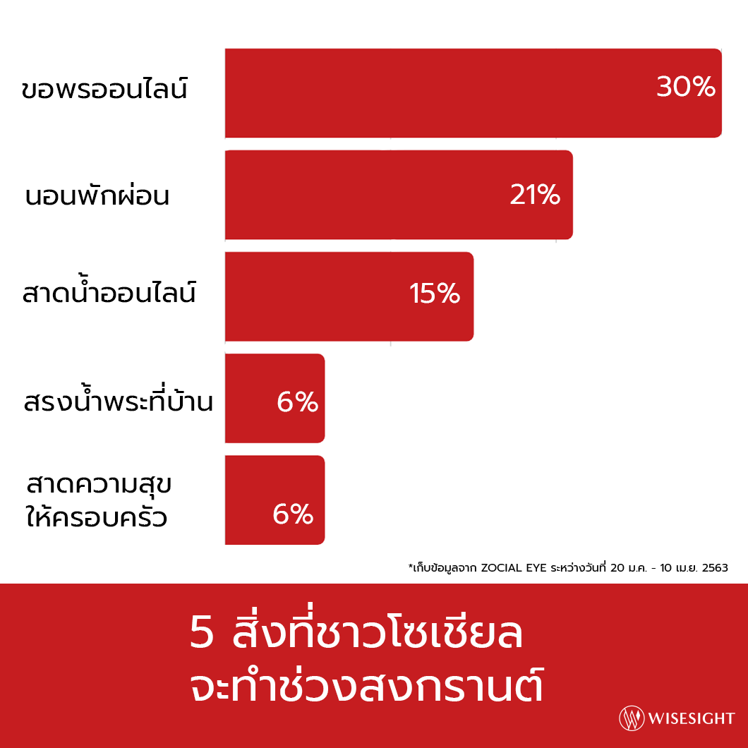 ในเมื่อในปีนี้สงกรานต์ได้หายไป ไม่ได้ออกไปเล่นน้ำข้างนอกได้เหมือนปีก่อนๆ แล้วชาวโซเชียลจะทำกิจกรรมอะไรแทนในวันสำคัญนี้ จากข้อมูลที่ได้สำรวจและวิเคราะห์มาพบว่า กิจกรรมยอดนิยม 5 อันดับแรกที่ชาวโซเชียลจะทำในช่วงสงกรานต์ก็คือ