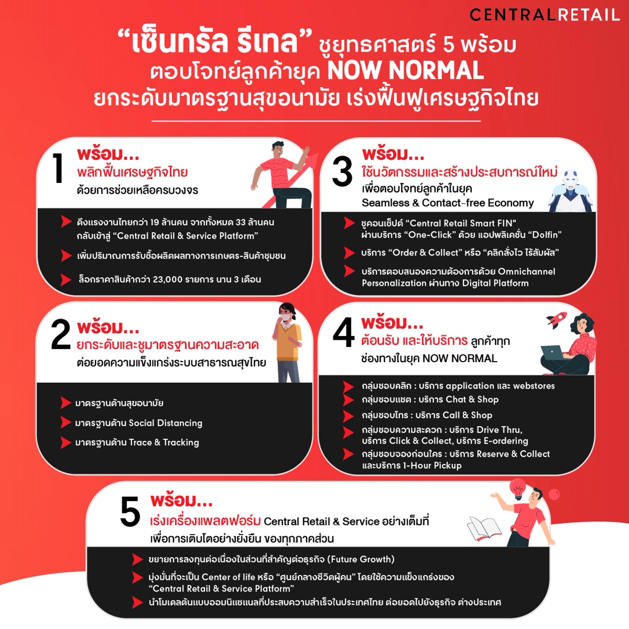 “New Normal ที่เกิดขึ้นในช่วง 2 เดือนที่ผ่านมา ได้กลายมาเป็น NOW NORMAL ของการดำเนินชีวิตและการทำธุรกิจในวันนี้ ซึ่งเซ็นทรัล รีเทลมั่นใจว่า “ยุทธศาสตร์ 5 พร้อม” และ “Central Retail & Service Platform” ซึ่งเป็นแพลตฟอร์มของคนไทย สร้างขึ้นเพื่อประโยชน์ของคนไทย จะช่วยขับเคลื่อนเศรษฐกิจไทย และยกระดับคุณภาพชีวิตของคนไทยทุกภาคส่วน โดยเฉพาะด้านสุขอนามัย อันจะเป็นการสร้างความมั่นใจให้แก่ภาครัฐ ภาคเอกชน คนไทยทุกคน รวมถึงนักท่องเที่ยวที่กำลังจะกลับเข้ามาในประเทศ และสามารถตอบโจทย์การเป็นแพลตฟอร์มของทุกคนได้อย่างแท้จริง”