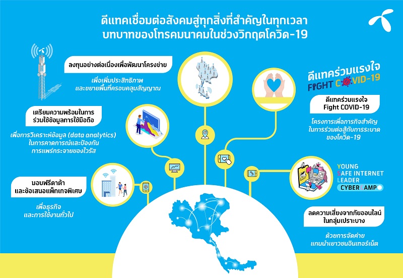 ดีแทคมีความมุ่งมั่นในการใช้ประโยชน์จากจุดแข็งขององค์กร ในการวิเคราะห์ข้อมูลจากการใช้งานมือถือเพื่อสนับสนุนภารกิจสำคัญของรัฐบาลในการต่อสู้กับการระบาดของโควิด-19 ดีแทคมีความพร้อมในการทำงานร่วมกับหน่วยงานภาครัฐที่เกี่ยวข้อง และผู้เชี่ยวชาญด้าน data analytics เพื่อสร้างแบบจำลองการประเมินของพื้นที่การระบาดในปัจจุบันและอนาคต ทั้งนี้ กลุ่มเทเลนอร์ได้ทำงานร่วมกับหน่วยงานด้านสุขภาพในหลายประเทศ รวมถึงกลุ่มประเทศในสแกนดิเนเวีย โดยจะถ่ายทอดประสบการณ์นี้กับดีแทคเพื่อต่อยอดการทำงานในวิกฤตนี้