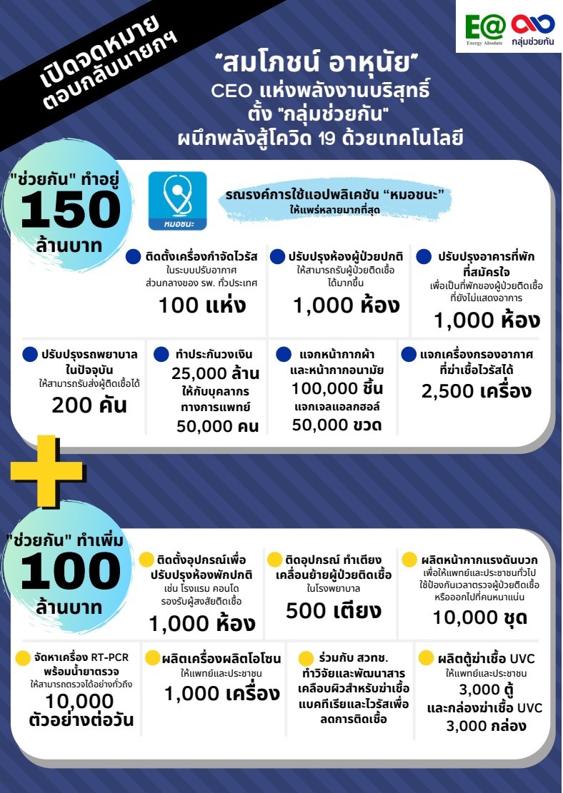 คุณสมโภชน์ กล่าวว่า นับตั้งแต่ทราบข่าวการพบผู้ป่วยโควิด-19 รายแรกในประเทศไทยเมื่อวันที่ 13 มกราคม พ.ศ. 2563 รู้สึกเป็นห่วงและได้ติดตามเหตุการณ์การแพร่ระบาดของโรคอย่างใกล้ชิด รวมถึงประเมินสิ่งที่จําเป็นที่ประเทศไทยอาจจะขาดแคลนในแต่ละกรณี โดยเฉพาะอย่างยิ่งในส่วนที่จะส่งเสริมและป้องกันบุคลากรทางการแพทย์ พร้อมทั้งลดการติดเชื้อตั้งแต่ต้นทาง เพื่อดำเนินการช่วยเหลือผู้ที่ได้รับผลกระทบอย่างมีประสิทธิภาพ โดยที่ผ่านมาได้ริเริ่มชักชวนผู้สนใจในทุกภาคส่วนจัดตั้ง “กลุ่มช่วยกัน” ซึ่งแบ่งการดำเนินงานเป็น 2 ส่วนหลักๆ ดังนี้
