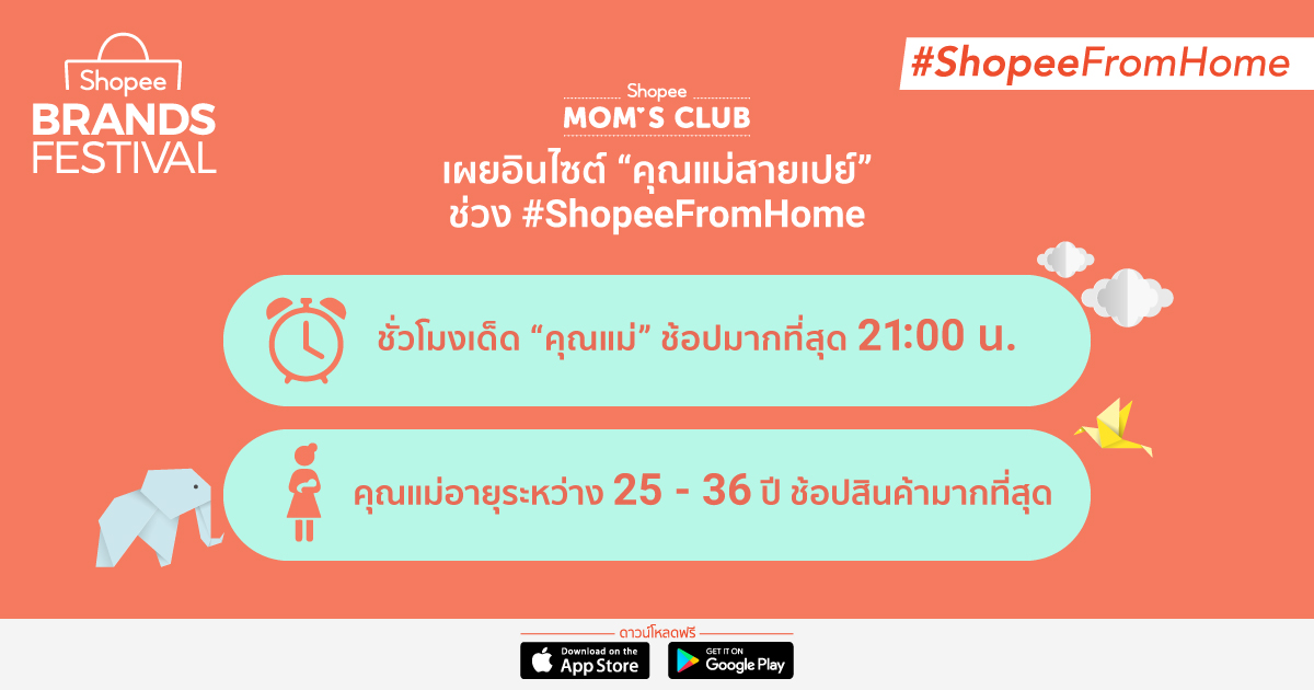 พร้อมกันนี้ ‘ช้อปปี้’ ยังมีการเปิดตัวรอยัลตี้โปรแกรมสุดเอ็กซ์คลูซีฟในรูปแบบของคอมมูนิตี้กับ Shopee Mom’s Club คลับเพื่อคุณแม่ยุคใหม่ที่ชื่นชอบการช้อปปิ้งออนไลน์โดยเฉพาะ โดย ‘ช้อปปี้’ ได้มอบสิทธิพิเศษมากมายให้กับสมาชิกผ่านข้อเสนอสุดพิเศษ อาทิ โค้ดส่งฟรีเพิ่มในทุกสัปดาห์ โค้ดลดเพิ่มอีก 20% ดีลสินค้าในราคาที่ดีที่สุด รวมถึงส่วนลดสุดเอ็กซ์คลูซีฟ และ Welcome Gift ในการร่วมมือกับแบรนด์สินค้าแม่และเด็กชั้นนำ อาทิ Pampers, Philips Avent, Enfagrow, Johnson & Johnson และอีกมากมาย พิเศษสำหรับช่วง Shopee Brands Festival นี้ สมาชิก Shopee Mom’s Club สามารถรับโค้ดเงินคืนสูงสุด 30% เพิ่มอีกด้วย